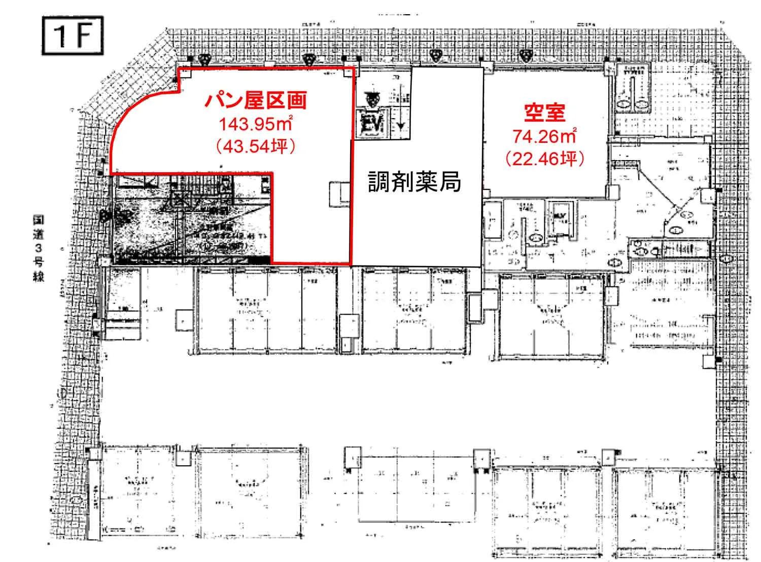 2階には内科、歯科が入居し調剤薬局に隣接したテナント物件。1階角地の区画は43.54坪と若干狭めですが2軒隣に22.46坪の区画があり必要面積が足りない場合、スタッフルーム、院長室、倉庫等を分離することにより区画を有効に使うことができます。